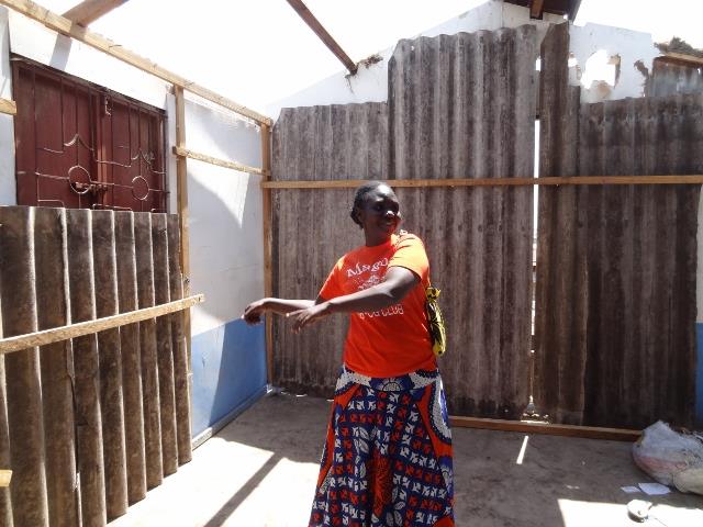 *この写真は、ドロボウが物品を放り投げていった穴をすぐに古いトタンで塞いだ場所をリリアンが見せてくれているところです。